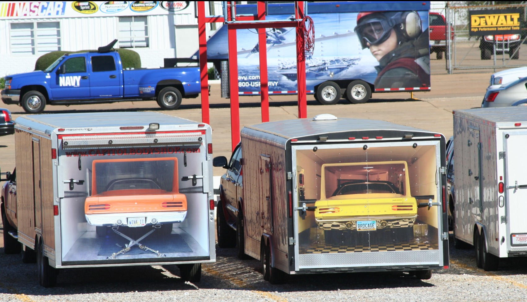Carl says he would probably not put a photo of a Corvette on the side of his enclosed trailer (that would be especially bad idea at a Talladega Family Reunion!); but would put his name or business name on the side.  He also would not hesitate to put a graphic of a rare car on the side – just because it would make the trailer more noticeable and tougher to hide by the thief. The idea of a Talladega or Spoiler II on the side might help promote that cars as well. Although I am not sure enough people would notice the Talladega in the photo wasn’t a Torino or even a Mustang!