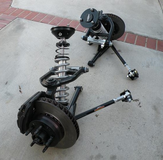 Thursday I picked up the crate with my Boss 560 engine and parts after it had cleared the Customs. Here are a couple of pictures, one with the crate on the truck on our way to the garage and one while unpacking it from the crate. As you see Rick had hooked up the black SS hoses to the Oil Cooler and Dry Sump Tank in the crate… good for me when I’m putting it into the car later. I’ve also got some other parts from Rick, complete Global West Front End Coil-Over Kit modified with Nascar Spindles, Rotors, Hats and Calipers, see attached picture. Rick removed the Ball Joint mounts on the A-arm and bigger mounts for Nascar Ball Joints was welded in. I’ve also got two Holley 1050 Carburetors, one with Choke Horns and one without Choke Horns. The one without Choke Horns was the one that gave most HP on the Dyno, see links below from the Dyno test.