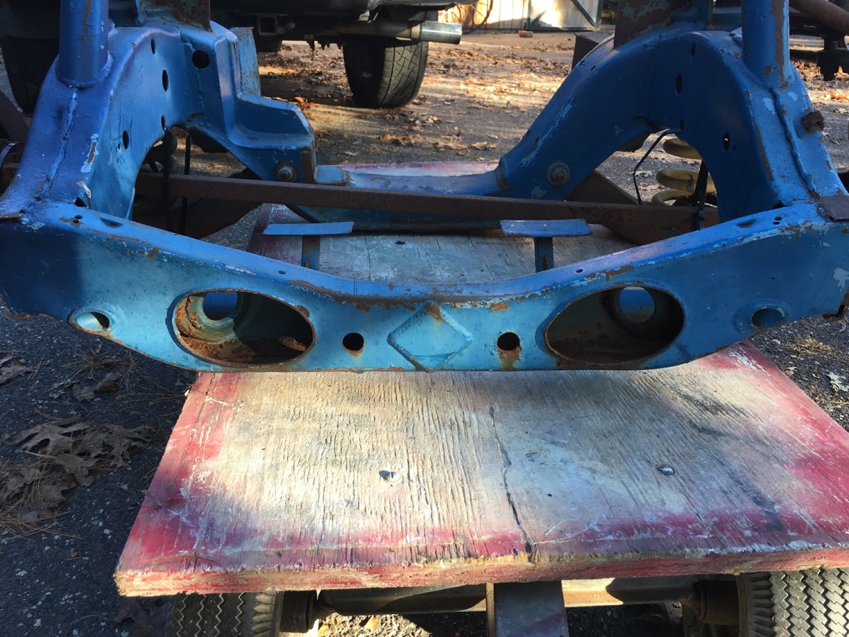 Banjo Matthews went into the chassis building business in late 1971 with a little help from Bud Moore. Bud gave Banjo a surface plate (Ford had given Bud two) and a wire feed welder. And he also placed the first order for a customer car with BM. Bud’s first car was the now well know #15 Sta-Power 1972 Torino (that, interestingly, was first painted with left over T/A Mustang school bus yellow paint, BTW). That chassis featured a front clip that had been welded up from raw steel tubing as a simulacrum of the modified 1965-1966 Galaxie frame snouts that had first been used in half chassis cars (when NASCAR first allowed Holman Moody to build them in late 1966). The use of stock Galaxie based front snouts ended at H&M in mid 1969 (per Ralph Moody) when NASCAR first allowed the use of the fully fabricated style snouts that Banjo and Hutch also built when they carried on after H&M’s demise. This is a long way of noting that the snout pictured, based as it is on a stock Galaxie frame section, is NOT a Banjo snout as claimed. So far as I know, Banjo never built a car with a Galaxie based snout. He had no need to since he was able from the jump to build all new snouts from raw steel. No modifications to stock frame rails was necessary. The snout pictured appears to be from a later racing period than the early 70s as well based on the configuration of the spring perches and the lowered location of the front sway bar. It does appear to be well built and should serve the replica Talladega project well. Control arms and steering gear will all be 1965 Galaxie (either original modified/reinforced) components (except for a special narrowed drag link) or fabricated versions. H&M spindles were probably originally used. But, if that snout was built late enough, Stock Car Products spindles and hubs could also have been used.