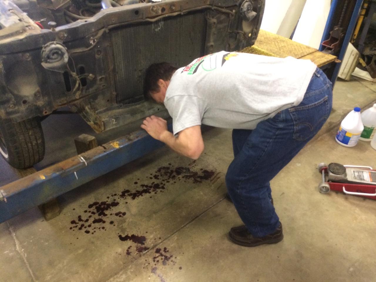 I was trying to jack the car up to slide the car lift ramps under the wheels. I Couldn’t get the front high enough. You know there isn’t a good place to jack the front of these cars up. I put wood blocks under the front wheels and wood blocks on the jack. I should have put jack stands under the front. My head shouldn’t have there to start with but it was.