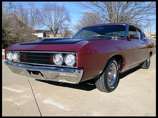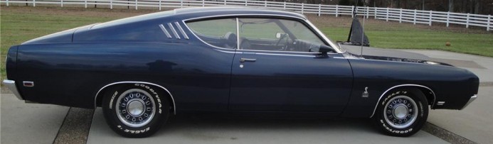 In January and February of 1969, using its Atlanta plant, Ford produced only 754 Talladegas. (6 Prototypes of various colors; 5 Pilot cars, all white; and 736 Production cars in three colors: Royal Maroon, Wimbledon White and Presidential Blue plus one special for Ford President Bunkie Knudson in yellow.) The Production interiors were all black vinyl, with cloth bench seats, no tach or clock, and just an AM radio. Talladegas were given special “T” plates on the doors just above the handles, a “T” in a circle on the rear fake gas cap, and “Talladega” nameplates inside on the door panels. All regular Production Talladegas were identical except for the paint. All Production Talladegas received the 428 cubic inch Cobra Jet engine rated at 335hp, a C6 automatic transmission, staggered rear shocks, and non-posi 3.25:1 rear end. Talladegas are the only automatic equipped Torinos to receive the Drag Pack staggered shocks.